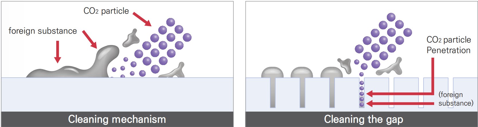 The CO2 particle penetrates between the foreign materials through the cracks and simultaneously sublimates, and expands in volume by more than 800 times to lift only the foreign materials upward.